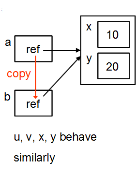 An object is created somewhere in memory, holding the values of the 2 properties x and y. Variable a contains a reference to that memory location, in a form which the system can use but we cannot. The assignment to b copies the reference so that then both a and b refer to the same object.